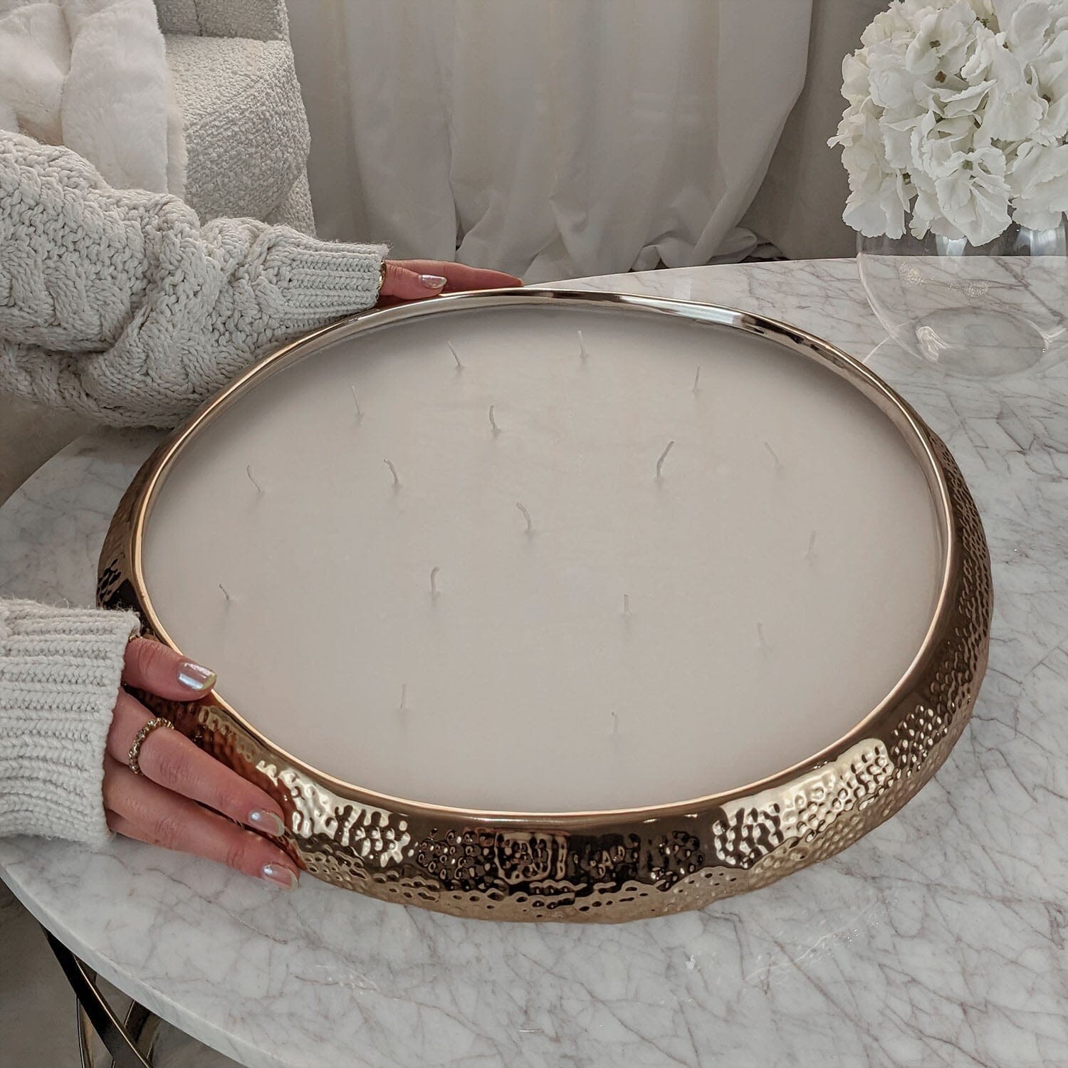 With its impressive size in a luxe bronze finish and 17 flickering wicks, this candle demands attention in any room.