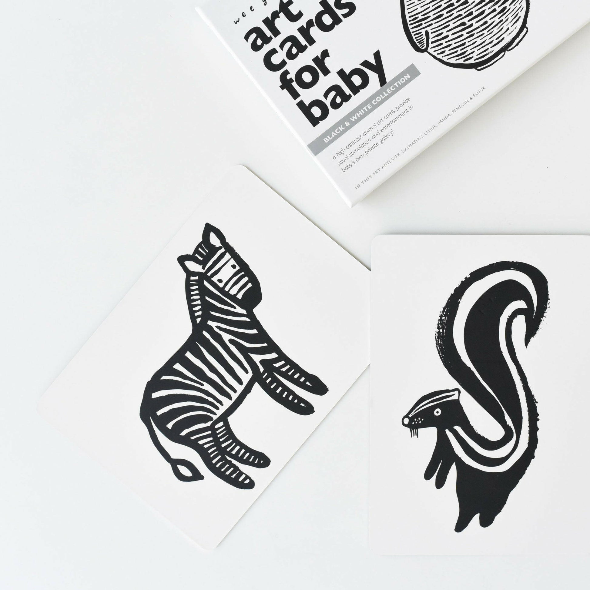 Babies are fascinated with black-and-white designs. Right from the start, these art cards begin developing a baby's visual perception. The six adorable animals in this set include a Penguin, Orca, Lemur, Skunk, Panda and Zebra. Printed on sturdy board, these cards will stand up to baby's explorations. Each 5"x7" card is beautifully finished with matte lamination and child-friendly rounded corners.
