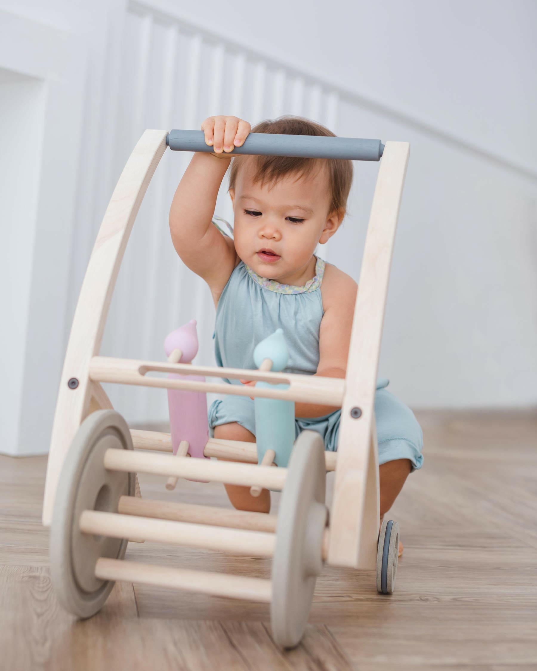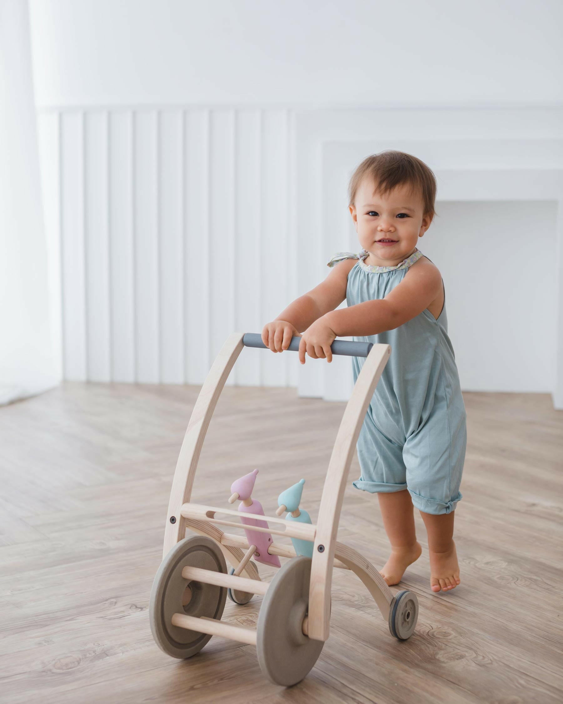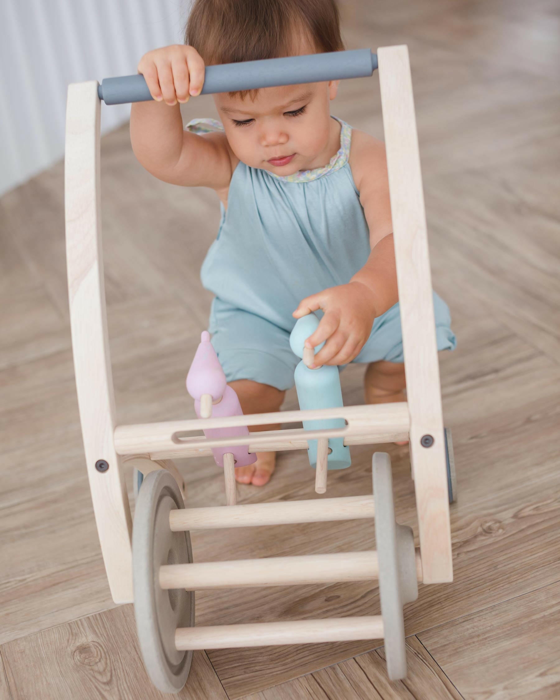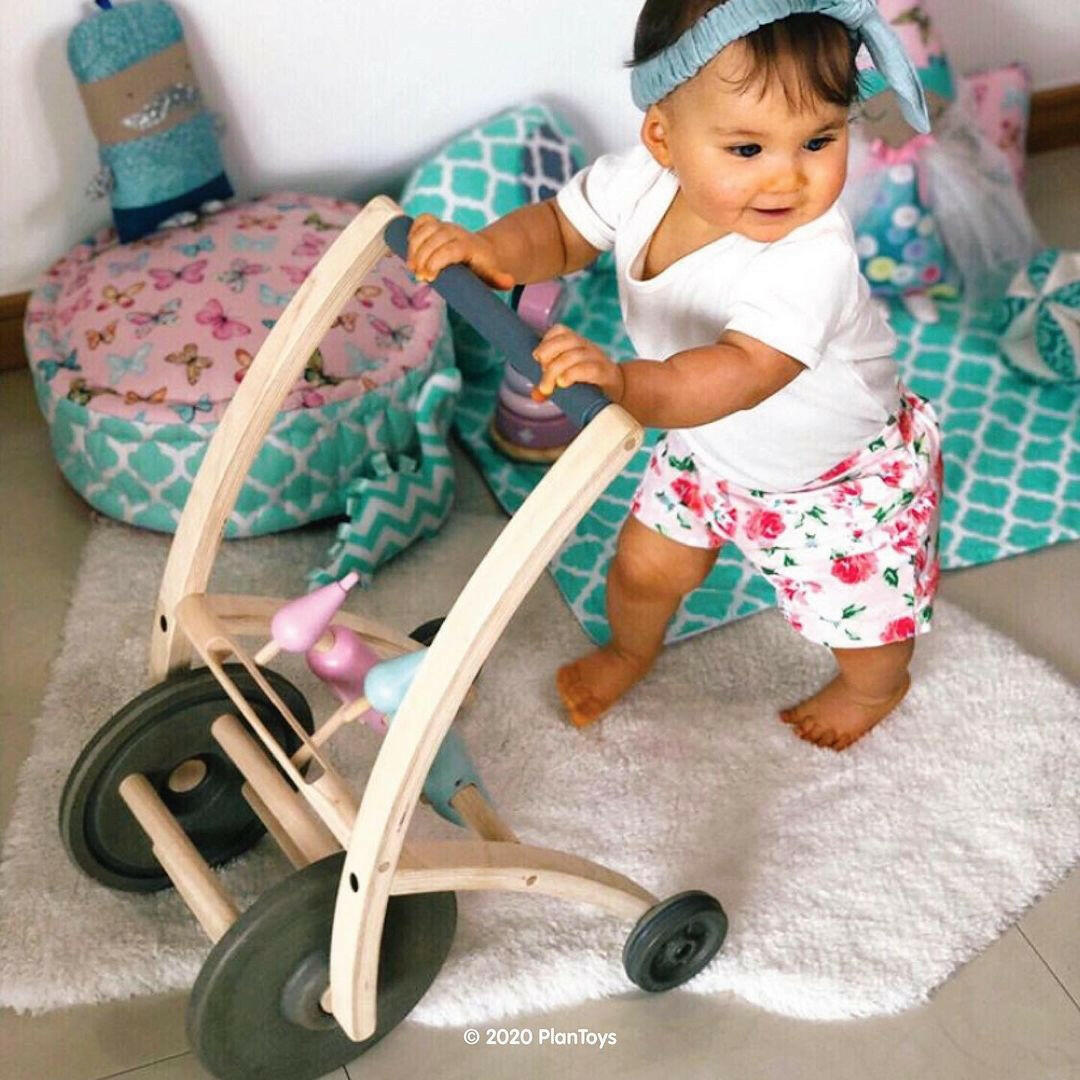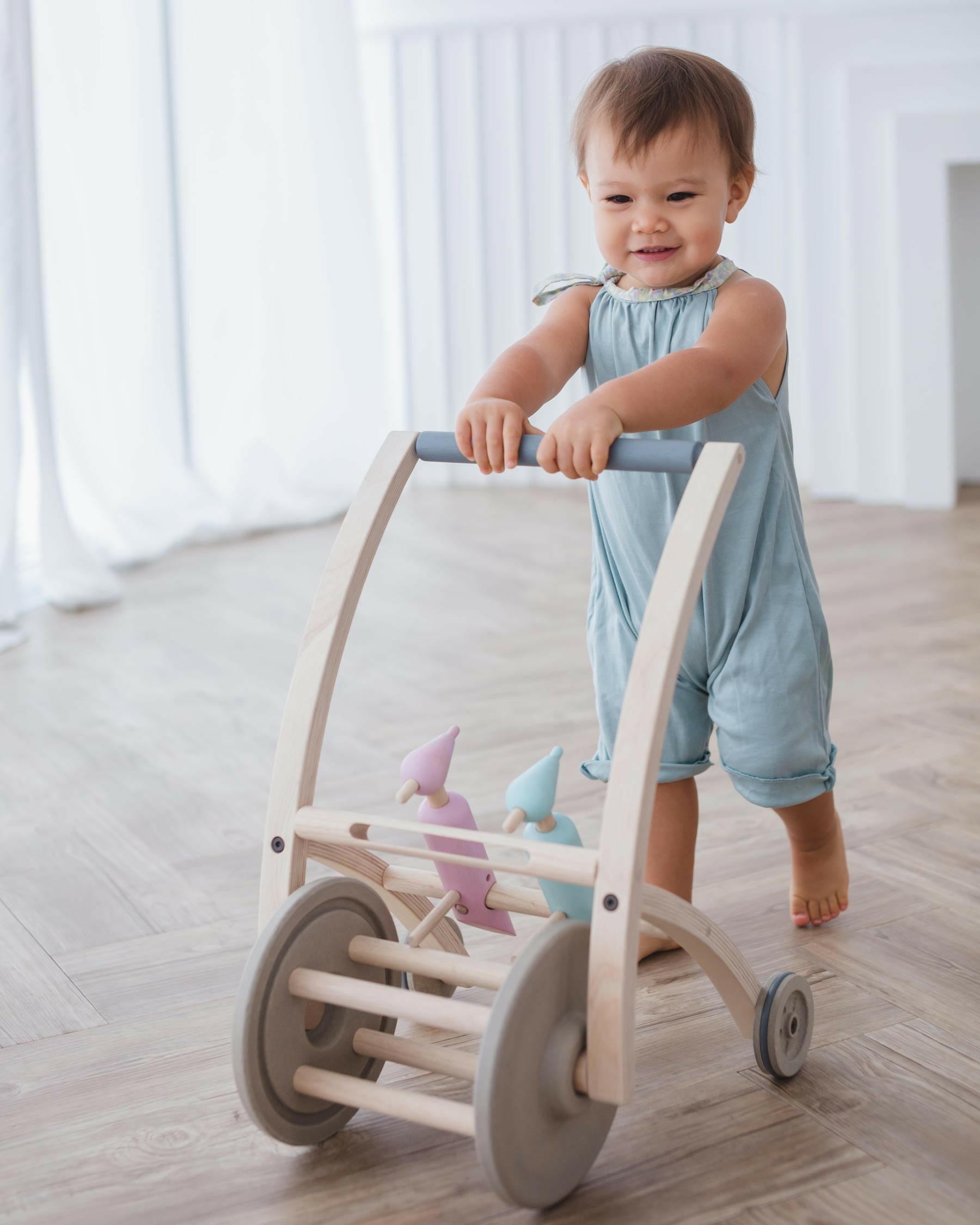 Our Plan Toys Woodpecker Walker is an adorable and functional push walker for babies that are standing already and ready to practice their walking skills for the first time. If your toddler is already walking they will love the stability our woodpecker walker provides them and the fun sound of the bird pecks as they move forward.